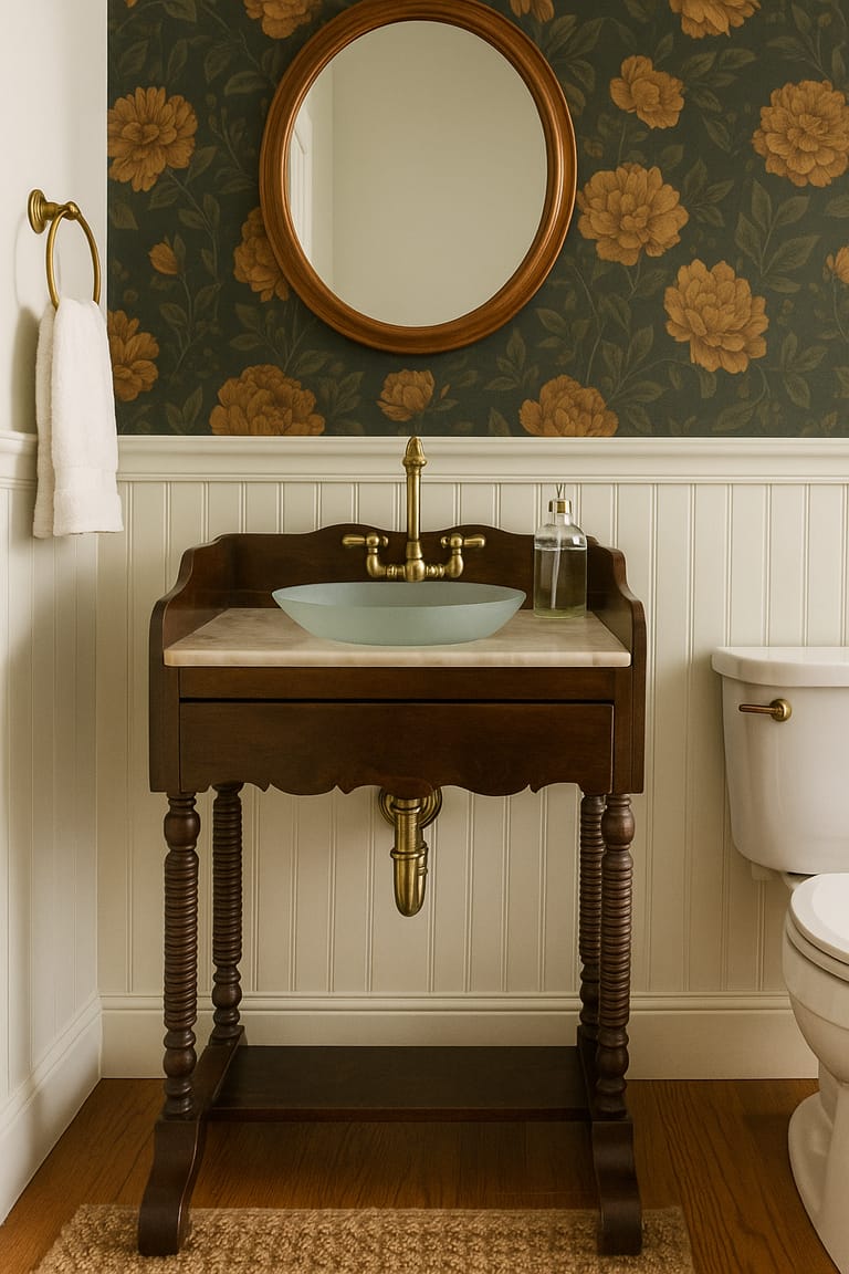 Cuba de Vidro: A cuba de vidro adiciona um toque de modernidade e leveza ao design vintage do lavabo.
